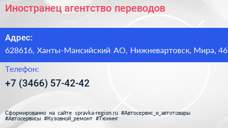Иностранец, агентство переводов по адресу 628616, Ханты-Мансийский АО, Нижневартовск, Мира, 46 в дальнейшем Организация, размещена в следующих категориях: