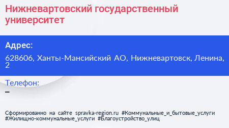 Нижневартовский государственный университет по адресу 628606, Ханты-Мансийский АО, Нижневартовск, Ленина, 2 в дальнейшем Организация, размещена в следующих категориях: