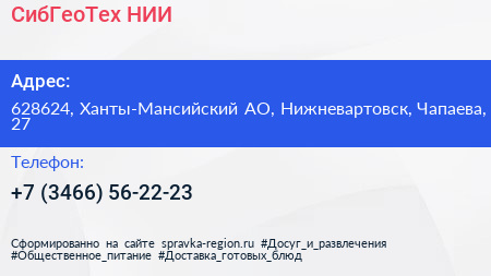 СибГеоТех, НИИ по адресу 628624, Ханты-Мансийский АО, Нижневартовск, Чапаева, 27 в дальнейшем Организация, размещена в следующих категориях: