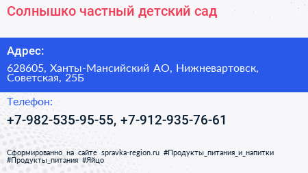 Солнышко, частный детский сад по адресу 628605, Ханты-Мансийский АО, Нижневартовск, Советская, 25Б в дальнейшем Организация, размещена в следующих категориях: