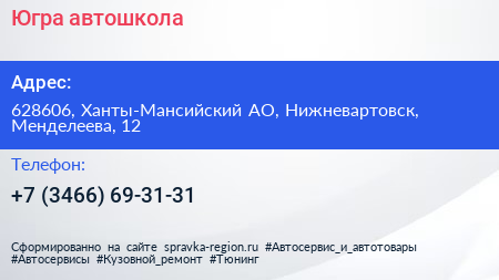 Югра, автошкола по адресу 628606, Ханты-Мансийский АО, Нижневартовск, Менделеева, 12 в дальнейшем Организация, размещена в следующих категориях: