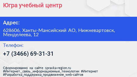 Югра, учебный центр по адресу 628606, Ханты-Мансийский АО, Нижневартовск, Менделеева, 12 в дальнейшем Организация, размещена в следующих категориях: