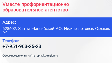 Vместе, профориентационно-образовательное агентство по адресу 628602, Ханты-Мансийский АО, Нижневартовск, Омская, 62 в дальнейшем Организация, размещена в следующих категориях: