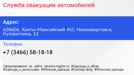 Служба эвакуации автомобилей по адресу 628606, Ханты-Мансийский АО, Нижневартовск, Кузоваткина, 12 в дальнейшем Организация, размещена в следующих категориях: