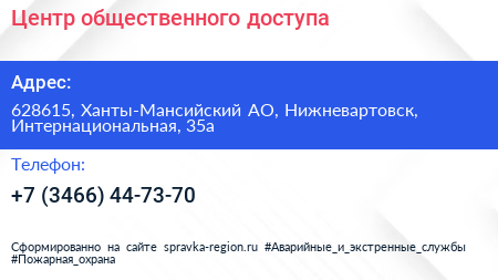 Центр общественного доступа по адресу 628615, Ханты-Мансийский АО, Нижневартовск, Интернациональная, 35а в дальнейшем Организация, размещена в следующих категориях: