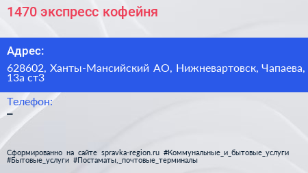 1470, экспресс-кофейня по адресу 628602, Ханты-Мансийский АО, Нижневартовск, Чапаева, 13а ст3 в дальнейшем Организация, размещена в следующих категориях: