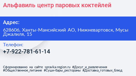 Альфавиль, центр паровых коктейлей по адресу 628606, Ханты-Мансийский АО, Нижневартовск, Мусы Джалиля, 15 в дальнейшем Организация, размещена в следующих категориях:
