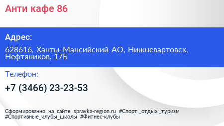 Анти-кафе 86 по адресу 628616, Ханты-Мансийский АО, Нижневартовск, Нефтяников, 17Б в дальнейшем Организация, размещена в следующих категориях: