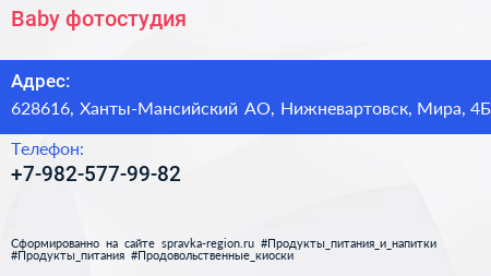 Baby, фотостудия по адресу 628616, Ханты-Мансийский АО, Нижневартовск, Мира, 4Б в дальнейшем Организация, размещена в следующих категориях: