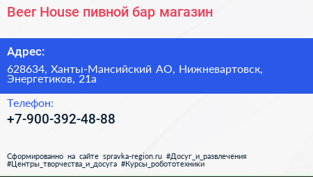 Beer House, пивной бар-магазин по адресу 628634, Ханты-Мансийский АО, Нижневартовск, Энергетиков, 21а в дальнейшем Организация, размещена в следующих категориях: