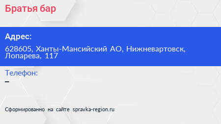 Братья, бар по адресу 628605, Ханты-Мансийский АО, Нижневартовск, Лопарева, 117 в дальнейшем Организация, размещена в следующих категориях: