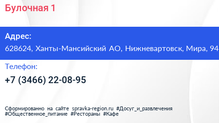 Булочная №1 по адресу 628624, Ханты-Мансийский АО, Нижневартовск, Мира, 94 в дальнейшем Организация, размещена в следующих категориях:
