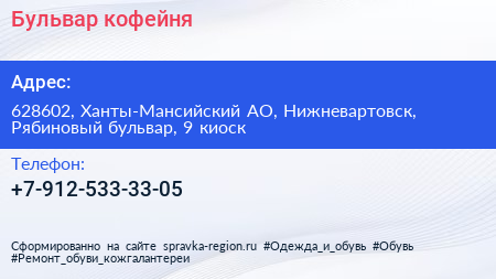Бульвар, кофейня по адресу 628602, Ханты-Мансийский АО, Нижневартовск, Рябиновый бульвар, 9 киоск в дальнейшем Организация, размещена в следующих категориях: