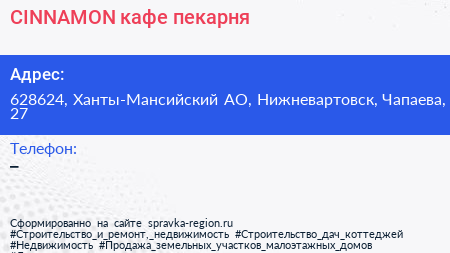 CINNAMON, кафе-пекарня по адресу 628624, Ханты-Мансийский АО, Нижневартовск, Чапаева, 27 в дальнейшем Организация, размещена в следующих категориях: