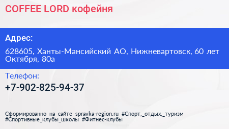 COFFEE LORD, кофейня по адресу 628605, Ханты-Мансийский АО, Нижневартовск, 60 лет Октября, 80а в дальнейшем Организация, размещена в следующих категориях: