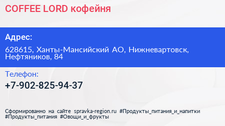 COFFEE LORD, кофейня по адресу 628615, Ханты-Мансийский АО, Нижневартовск, Нефтяников, 84 в дальнейшем Организация, размещена в следующих категориях: