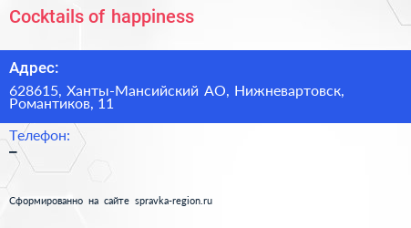 Cocktails of happiness по адресу 628615, Ханты-Мансийский АО, Нижневартовск, Романтиков, 11 в дальнейшем Организация, размещена в следующих категориях:
