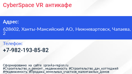 CyberSpace VR, антикафе по адресу 628602, Ханты-Мансийский АО, Нижневартовск, Чапаева, 2 в дальнейшем Организация, размещена в следующих категориях: