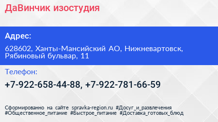 ДаВинчик, изостудия по адресу 628602, Ханты-Мансийский АО, Нижневартовск, Рябиновый бульвар, 11 в дальнейшем Организация, размещена в следующих категориях:
