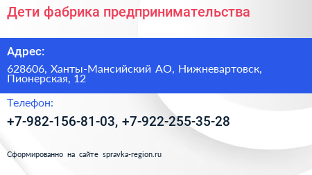 Дети, фабрика предпринимательства по адресу 628606, Ханты-Мансийский АО, Нижневартовск, Пионерская, 12 в дальнейшем Организация, размещена в следующих категориях: