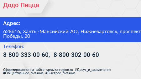 Додо Пицца по адресу 628616, Ханты-Мансийский АО, Нижневартовск, проспект Победы, 20 в дальнейшем Организация, размещена в следующих категориях: