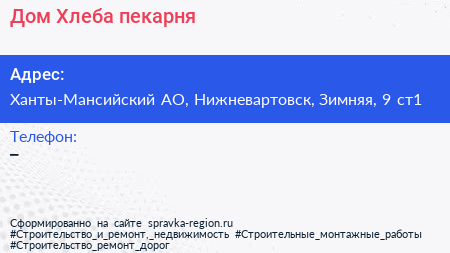 Дом Хлеба, пекарня по адресу Ханты-Мансийский АО, Нижневартовск, Зимняя, 9 ст1 в дальнейшем Организация, размещена в следующих категориях: