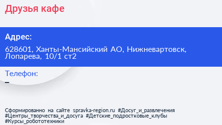 Друзья, кафе по адресу 628601, Ханты-Мансийский АО, Нижневартовск, Лопарева, 10/1 ст2 в дальнейшем Организация, размещена в следующих категориях: