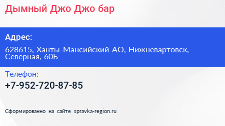 Дымный Джо-Джо, бар по адресу 628615, Ханты-Мансийский АО, Нижневартовск, Северная, 60Б в дальнейшем Организация, размещена в следующих категориях: