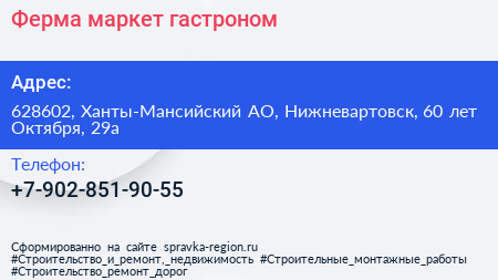 Ферма маркет, гастроном по адресу 628602, Ханты-Мансийский АО, Нижневартовск, 60 лет Октября, 29а в дальнейшем Организация, размещена в следующих категориях:
