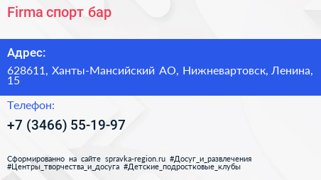 Firma, спорт-бар по адресу 628611, Ханты-Мансийский АО, Нижневартовск, Ленина, 15 в дальнейшем Организация, размещена в следующих категориях: