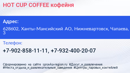 HOT CUP COFFEE, кофейня по адресу 628602, Ханты-Мансийский АО, Нижневартовск, Чапаева, 3 в дальнейшем Организация, размещена в следующих категориях: