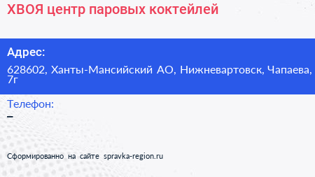 ХВОЯ, центр паровых коктейлей по адресу 628602, Ханты-Мансийский АО, Нижневартовск, Чапаева, 7г в дальнейшем Организация, размещена в следующих категориях:
