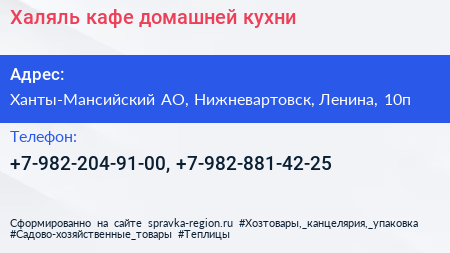 Халяль, кафе домашней кухни по адресу Ханты-Мансийский АО, Нижневартовск, Ленина, 10п в дальнейшем Организация, размещена в следующих категориях: