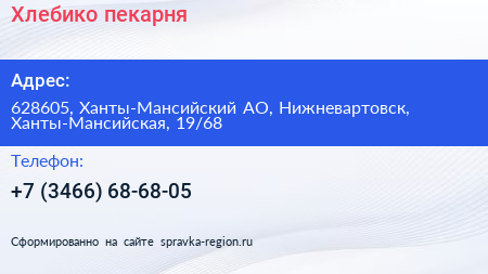 Хлебико, пекарня по адресу 628605, Ханты-Мансийский АО, Нижневартовск, Ханты-Мансийская, 19/68 в дальнейшем Организация, размещена в следующих категориях: