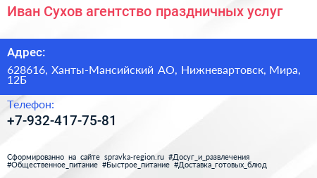 Иван Сухов, агентство праздничных услуг по адресу 628616, Ханты-Мансийский АО, Нижневартовск, Мира, 12Б в дальнейшем Организация, размещена в следующих категориях: