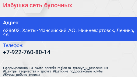 Избушка, сеть булочных по адресу 628602, Ханты-Мансийский АО, Нижневартовск, Ленина, 46 в дальнейшем Организация, размещена в следующих категориях: