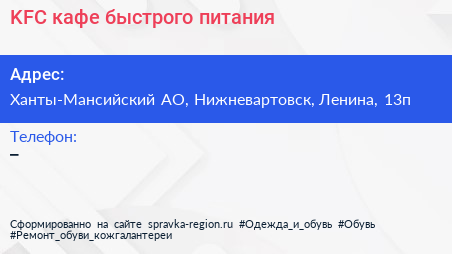 KFC, кафе быстрого питания по адресу Ханты-Мансийский АО, Нижневартовск, Ленина, 13п в дальнейшем Организация, размещена в следующих категориях:
