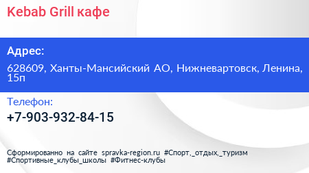 Kebab Grill, кафе по адресу 628609, Ханты-Мансийский АО, Нижневартовск, Ленина, 15п в дальнейшем Организация, размещена в следующих категориях: