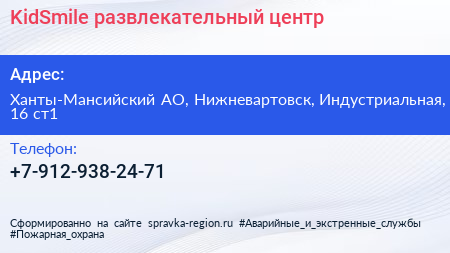 KidSmile, развлекательный центр по адресу Ханты-Мансийский АО, Нижневартовск, Индустриальная, 16 ст1 в дальнейшем Организация, размещена в следующих категориях: