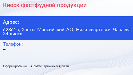 Киоск фастфудной продукции по адресу 628615, Ханты-Мансийский АО, Нижневартовск, Чапаева, 34 киоск в дальнейшем Организация, размещена в следующих категориях: