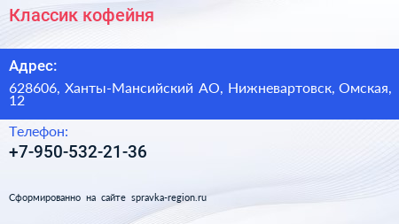 Классик, кофейня по адресу 628606, Ханты-Мансийский АО, Нижневартовск, Омская, 12 в дальнейшем Организация, размещена в следующих категориях: