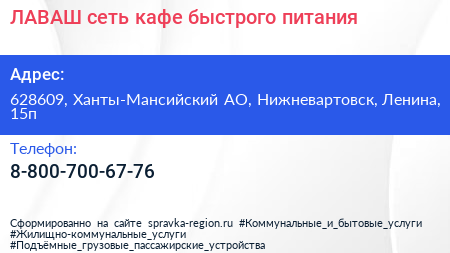 #ЛАВАШ, сеть кафе быстрого питания по адресу 628609, Ханты-Мансийский АО, Нижневартовск, Ленина, 15п в дальнейшем Организация, размещена в следующих категориях: