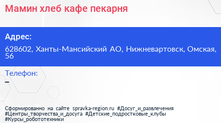 Мамин хлеб, кафе-пекарня по адресу 628602, Ханты-Мансийский АО, Нижневартовск, Омская, 56 в дальнейшем Организация, размещена в следующих категориях: