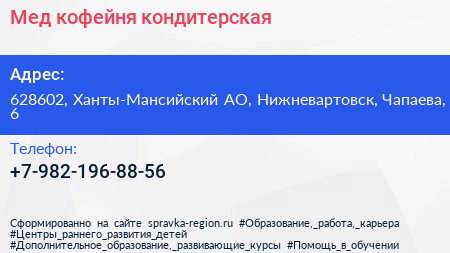 Мед, кофейня-кондитерская по адресу 628602, Ханты-Мансийский АО, Нижневартовск, Чапаева, 6 в дальнейшем Организация, размещена в следующих категориях: