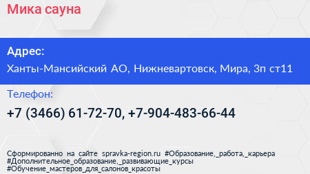 Мика, сауна по адресу Ханты-Мансийский АО, Нижневартовск, Мира, 3п ст11 в дальнейшем Организация, размещена в следующих категориях: