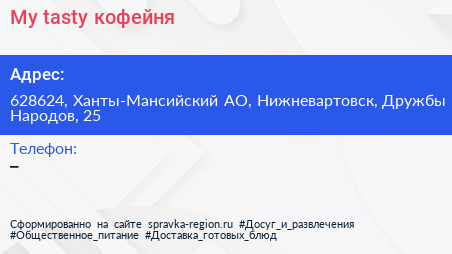My tasty, кофейня по адресу 628624, Ханты-Мансийский АО, Нижневартовск, Дружбы Народов, 25 в дальнейшем Организация, размещена в следующих категориях: