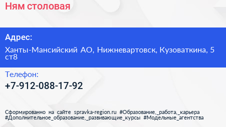 Ням, столовая по адресу Ханты-Мансийский АО, Нижневартовск, Кузоваткина, 5 ст8 в дальнейшем Организация, размещена в следующих категориях: