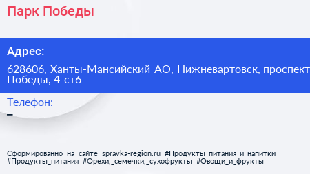 Парк Победы по адресу 628606, Ханты-Мансийский АО, Нижневартовск, проспект Победы, 4 ст6 в дальнейшем Организация, размещена в следующих категориях: