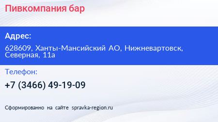 Пивкомпания, бар по адресу 628609, Ханты-Мансийский АО, Нижневартовск, Северная, 11а в дальнейшем Организация, размещена в следующих категориях: