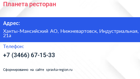 Планета, ресторан по адресу Ханты-Мансийский АО, Нижневартовск, Индустриальная, 21а в дальнейшем Организация, размещена в следующих категориях: